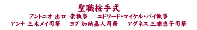 3月6日(土)10時30分より主教座聖堂にて、アントニオ出口崇聖職候補生とエドワード・マイケル・パイ聖職候補生の執事按手、アンナ三木メイ執事とヨブ加納嘉人執事とアグネス三浦恵子執事の司祭按手が執り行われました。当日は雨模様の天気でしたが、教区内外から300名を超える聖職・信徒が集まり、聖堂内がいっぱいになりました。