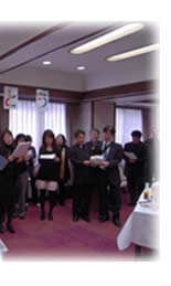 礼拝後は教区センターへ移動して祝会をし、参列者皆で鈴木新執事の誕生をお祝いしました。鈴木執事のご家族・ご両親・ご親戚の紹介、ご来賓の方のスピーチやエピソードの紹介、勤務教会である聖アグネス教会の皆さんによる歌のプレゼントがありました。