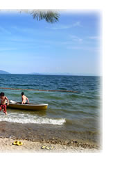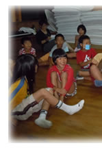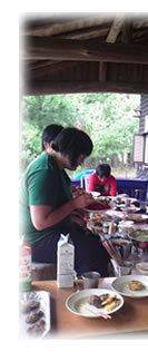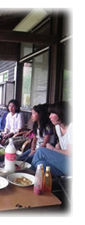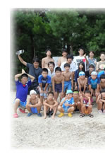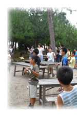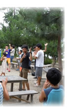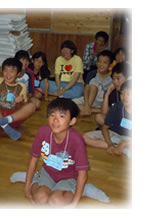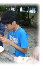 とても暑い日でしたので、午後はさっそく水泳をというところですが、このキャンプは、参加者ひとりひとりが協力して作り上げるキャンプですので、まずは夕ごはんのカレーライスの準備です。あとは煮込むだけにしてから、思いっきり琵琶湖に飛び込みました。 夕方からは、みんなでこれからどんなキャンプにしていくか話し合いました。キャンプ長を決め、これからの予定を決めていきました。このキャンプ場では欠かせない水泳や、ワーク、また食事のメニューや礼拝の当番など、みんなでわいわい言いながら相談しました。食事の準備もみんなでするとなると、多くの時間をそこに費やすことになります。楽しく遊ぶことばかりだけでなく、食事の準備も考えながら遊ばなくては、おなかをすかせてつらい時を過ごさなくてはなりません。でも初めてであった友だちとも、一緒に一つのものをつくり、それを分かち合うという体験は、なかなか機会のあることではありません。 ときには、気持ちが十分に伝わらず、つらい思いをしたり、疲れて楽しそうなみんなを見ながら休まなければならなかったりということもありますが、それでも、ひとりひとりの持っている賜物を寄せ合って4日間を過ごすことができました。 学校やクラブ活動、そして将来の目標など、それぞれの歩みに向かって、キャンプから出発しました。