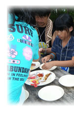 2日目の野外料理では「ミステリー餃子」を作りました。中の具材は、カレーやピザソース、チーズにコーン、さらに納豆や梅干し、果てはプリンやジャム、バナナなども用意され、子どもたちは思い思いの具材をそれぞれ包みました。子どもたちの作った餃子をいただくと、まさにミステリー!楽しい食事となりました。 他には、お天気にも恵まれ、水泳やゲーム大会、キャンプファイヤーに花火なども楽しみました。