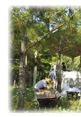 このキャンプ場は、これまでにも京都教区の高校生たちがワーク活動を通して、キャンプ場の整備のお手伝いをしてきました。今回は野外炊事場の柱のペンキ塗りをさせていただきました。