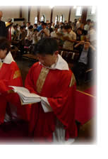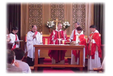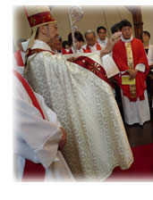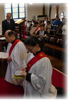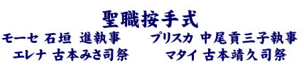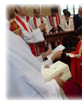 2015年7月18日(土)主教座聖堂(聖アグネス教会)で、石垣進聖職候補生、中尾貢三子聖職候補生、古本みさ執事、古本靖久執事の聖職按手式が行われました。台風の影響で交通機関の乱れもあるなか、京都教区内外から約230名の方々が集い、新執事・新司祭の誕生を共にお祝いしました。