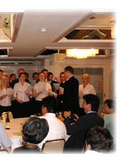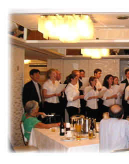 その後、ザ・パレスサイドホテルに場所を移し、懇親会が行われました。高地主教は感謝と歓迎の挨拶の中で、教会音楽の大切さをあらためて肌で感じましたと述べられました。また、キーブルカレッジのアヴリル・キャメロン学長は、「聖公会の繋がりの中で、今回、韓国・日本に来ることが出来嬉しく思います。我々はキーブルカレッジの一聖歌隊だけでなく、キーブルカレッジのみならずオックスフォード大学、大げさに言えば英国を代表して来ているという意識でおります。」と挨拶され、京都教区の歓迎にとても感謝されていました。参加された約80名と楽しい一時をともに過ごすことができました。