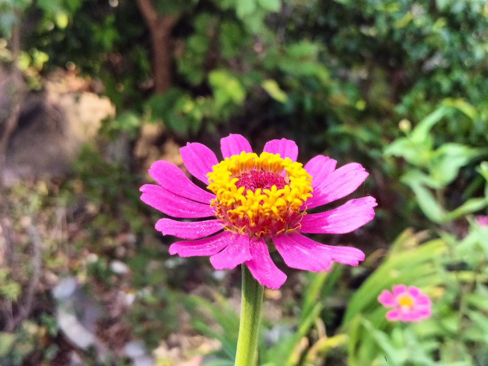 猛暑に耐えて道路脇に咲いている百日草(8月30日撮影)